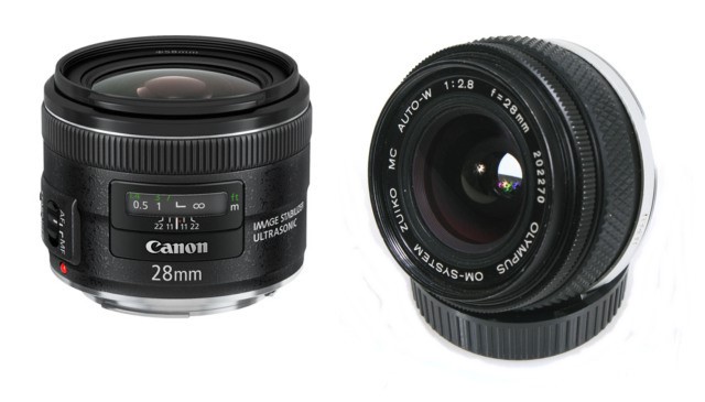 Olympus OM 28mm f2.8 lens for about £25 off eBay, add a